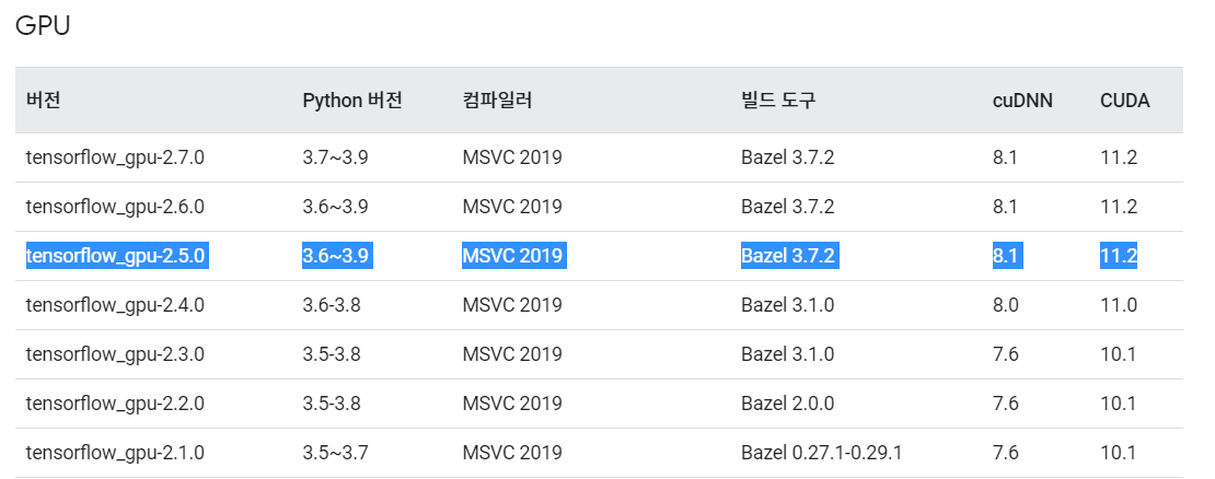 (사이트 참고 : https://www.tensorflow.org/install/source_windows#tested_build_configurations)