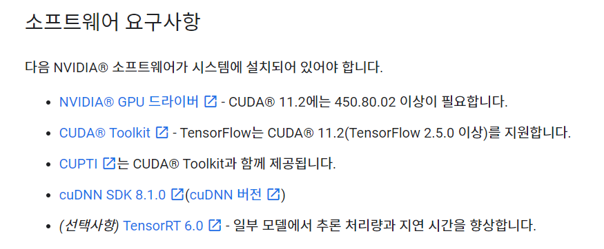 tensorflow 공식 문서에서 확인할 수 있습니다. 제가 체크했던 버전들과 새로 설치할 SW의 요구사항을 적절히 파악해 다운로드 받으면 됩니다.